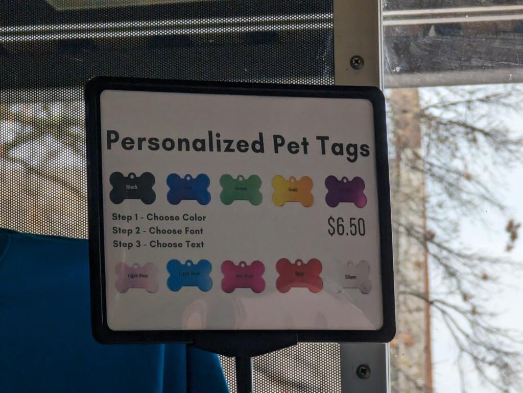 Get your personalized pet tag today.  Choose a color, font,  and up to 3 lines of text per tag.